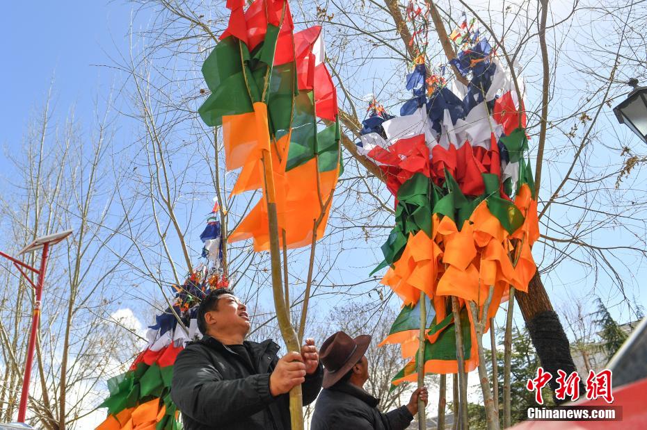 臨近藏歷新年,2月16日,在西藏拉薩街頭,農(nóng)牧民正縫制五彩經(jīng)幡樹(shù)。五彩經(jīng)幡樹(shù)是藏族民眾在藏歷新年前必備的年貨之一。藏歷新年期間,藏族民眾會(huì)選擇一個(gè)良辰吉日,為自家的房頂更換五彩經(jīng)幡樹(shù),祈求新的一年里五谷豐登,吉祥如意。圖為2月16日,普瓊在給顧客展示五彩經(jīng)幡樹(shù)。貢確 攝
