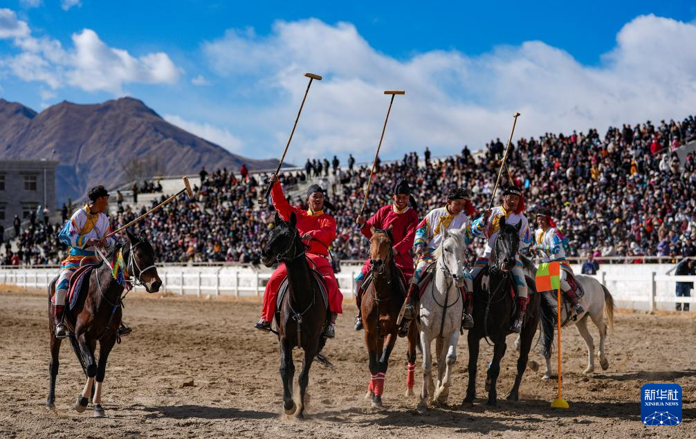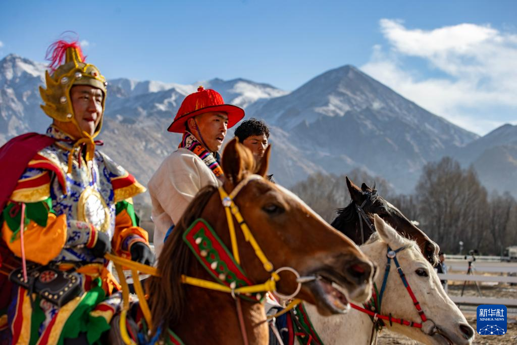 3月2日,馬術(shù)隊員在重現(xiàn)馬球比賽場景。新華社記者 晉美多吉 攝