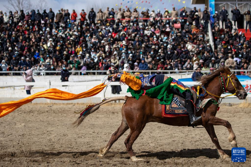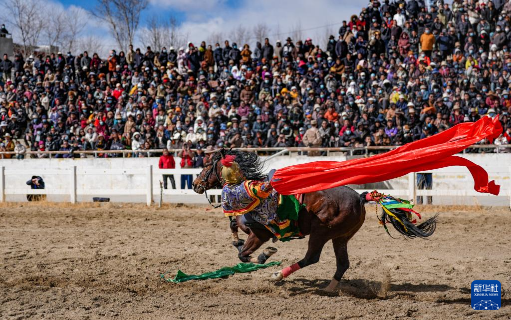 3月2日,馬術(shù)隊員在表演傳統(tǒng)馬術(shù)項目撿哈達(dá)。新華社記者 晉美多吉 攝?