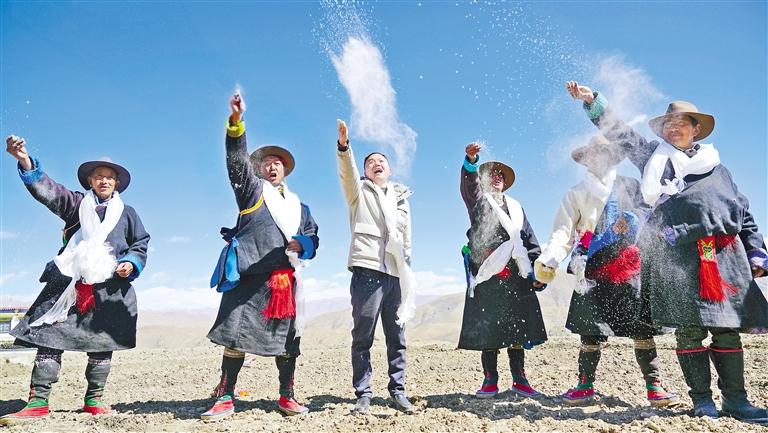 在定結(jié)縣2025年春耕開犁儀式現(xiàn)場,身著節(jié)日盛裝的村民向參加開犁儀式的群眾獻上潔白的哈達,舉行傳統(tǒng)的祈福儀式,吃“切瑪”、敬青稞酒、獻哈達,每一個動作都飽含著對土地的感恩。伴隨著拖拉機的陣陣轟鳴聲,平整的土地被犁出一道道整齊的壟溝,奏響了春耕的“交響曲”。姑娘們緊隨其后,熟練地向地里播撒青稞種子,動作輕盈而流暢。隨后,大家一同將手中的糌粑撒向天空,共同祈愿新的一年風調(diào)雨順、五谷豐登?,F(xiàn)場氣氛熱烈而莊重,每個人的臉上都洋溢著對未來美好生活的憧憬。儀式最后,大家跳起傳統(tǒng)鍋莊,歡快的舞步、悠揚的歌聲,展現(xiàn)出對美好生活的無限向往。