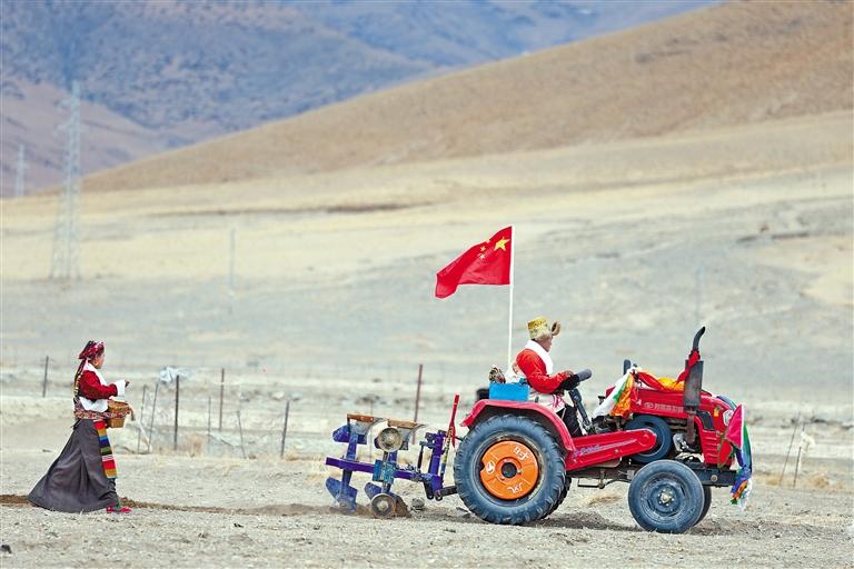 薩嘎縣春耕春播儀式上,村民開著拖拉機在前犁地,婦女在后撒青稞種子。