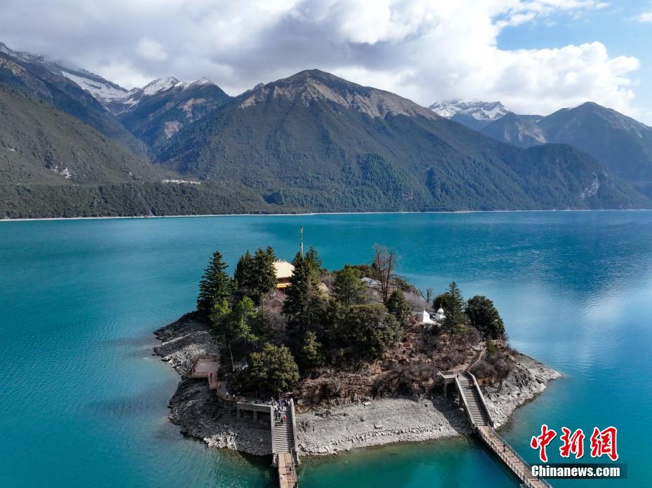 3月30日,航拍巴松措湖心島。巴松措又名錯(cuò)高湖,位于西藏自治區(qū)林芝市工布江達(dá)縣,是西藏首個(gè)自然風(fēng)景類國(guó)家5A級(jí)旅游風(fēng)景區(qū)。從空中俯瞰巴松措,碧藍(lán)的湖水被雪山、森林環(huán)繞,宛如鑲嵌在群山間的“藍(lán)寶石”。(無人機(jī)照片)中新社記者 馬銘言 攝