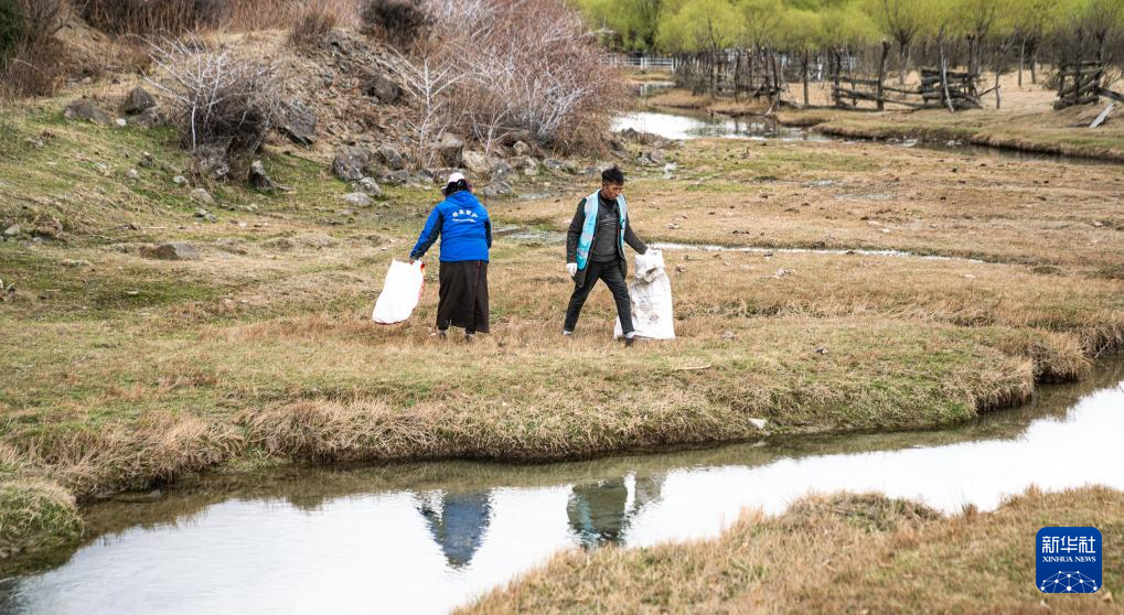 4月4日,雅尼國家濕地公園管護員在巡護途中清理垃圾。新華社記者 丁增尼達 攝?