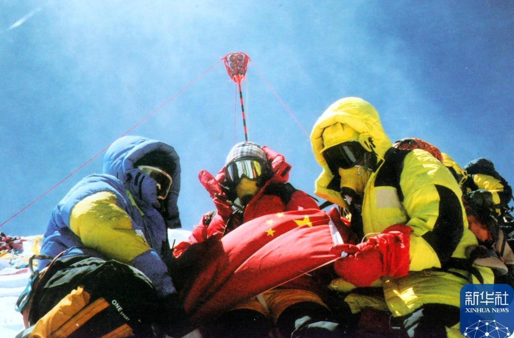 2005年5月22日,中國重測珠峰高度測量登山隊隊員在峰頂操作完設(shè)備后合影留念。新華社發(fā)