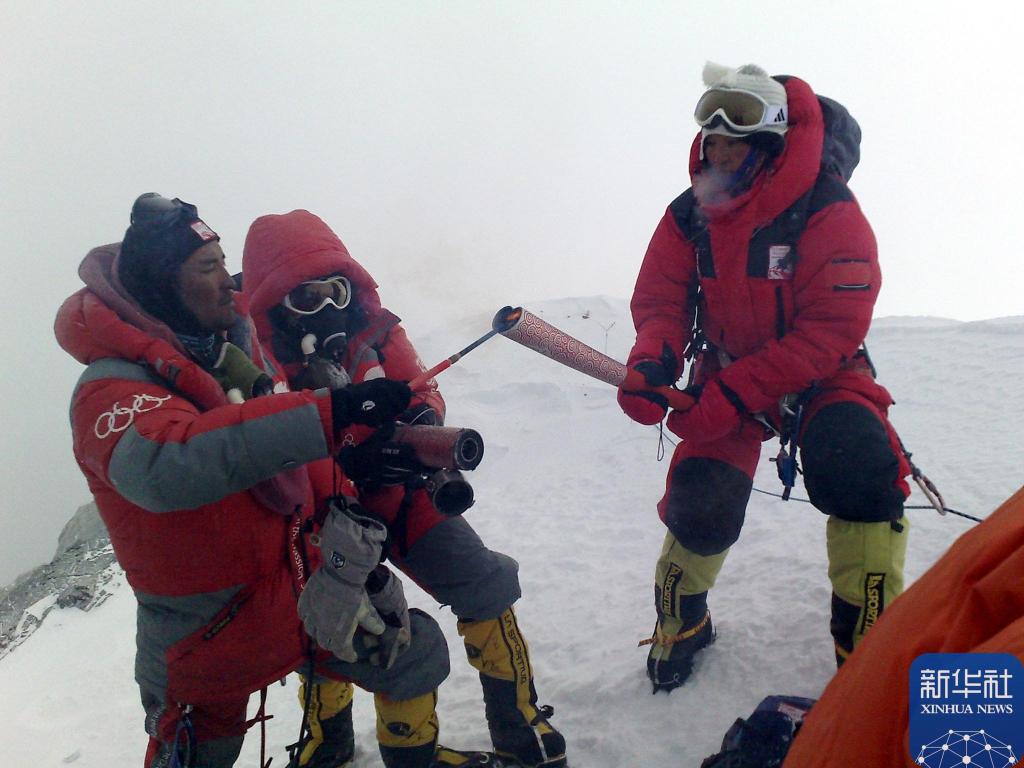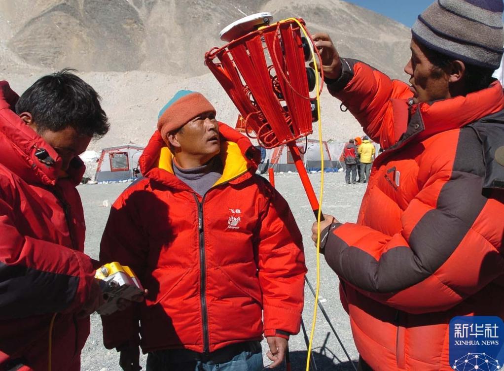 2020年5月27日,2020珠峰高程測量登山隊隊員在珠峰峰頂開展測量工作。新華社特約記者 扎西次仁 攝