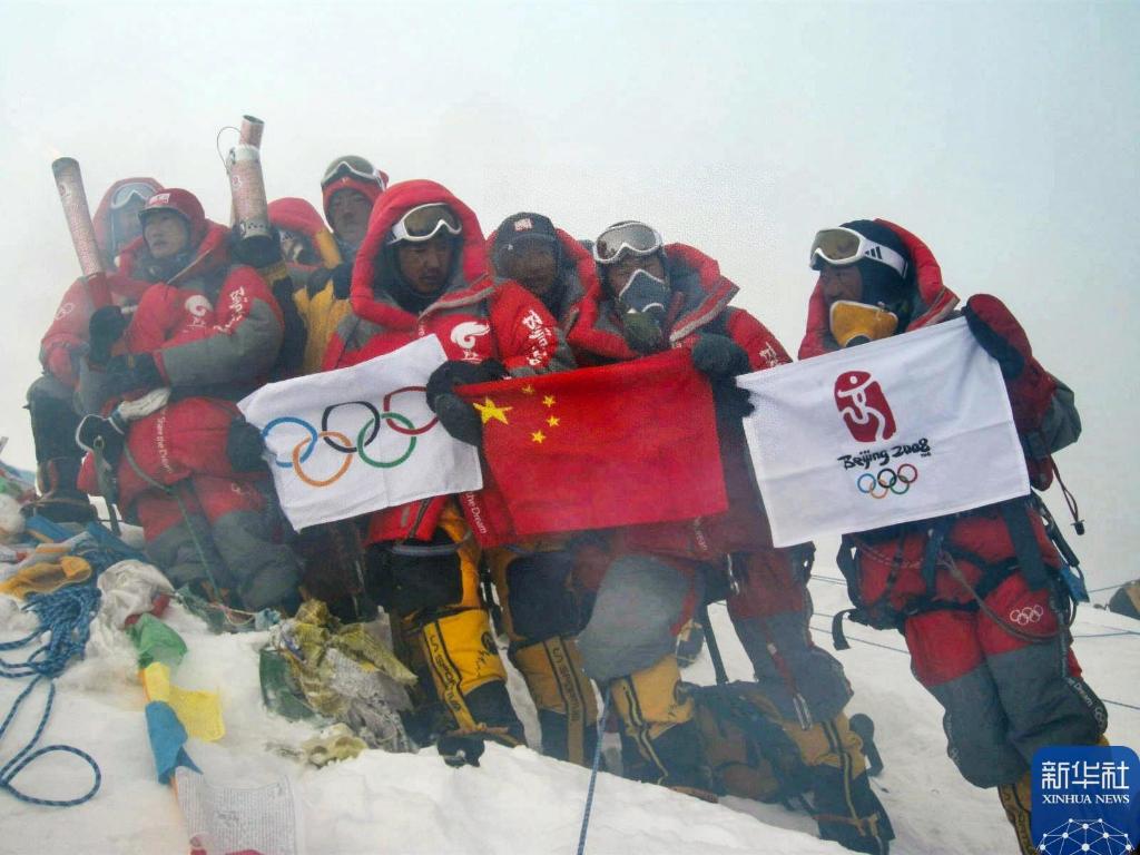 2008年5月8日,北京奧運圣火珠峰傳遞登山隊跨過珠峰第二臺階后,迎接新曙光。新華社特約記者 尼瑪次仁 攝