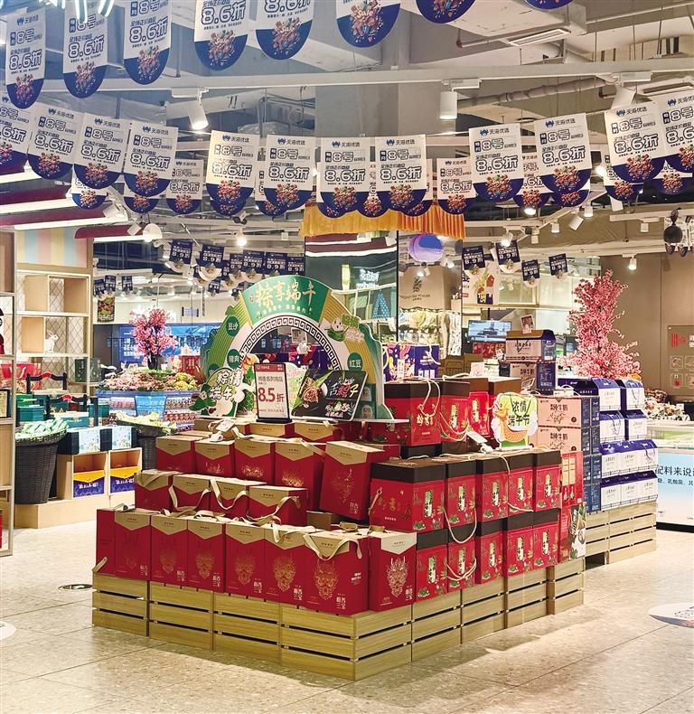 天海優(yōu)選超市,粽子禮盒被擺放在超市入口最顯眼處。
