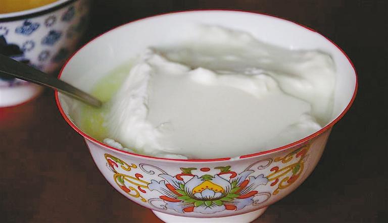除了常規(guī)的高蛋白大餐,西藏還有許多特色美食,酸奶拌飯便是夏日爽口美食之一。酸奶帶著牦牛奶獨特的鮮味,提煉后形如“豆腐腦”,白嫩滑溜,口感微酸與微甜交織,令人身心愉悅。在藏族世代延續(xù)的飲食文化中,酸奶拌飯因其豐富的營養(yǎng)價值,深受人們喜愛。
