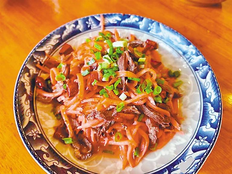 這道酸蘿卜炒牛肉也出現(xiàn)在了旺扎家的團圓飯上,厚切的牛肉帶著恰到好處的酸味,深受一家人喜愛?!斑@道菜色香味俱全,大家都愛吃。”旺扎爺爺笑著說。