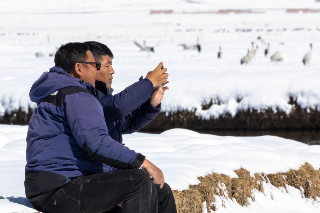 當(dāng)雄縣野生動物疫源疫病監(jiān)測員尼瑪頓珠(左)和同事扎西頓珠在雪后的阿熱濕地觀察遷徙途中的黑頸鶴(2024年4月7日攝)。 新華社記者 姜帆 攝