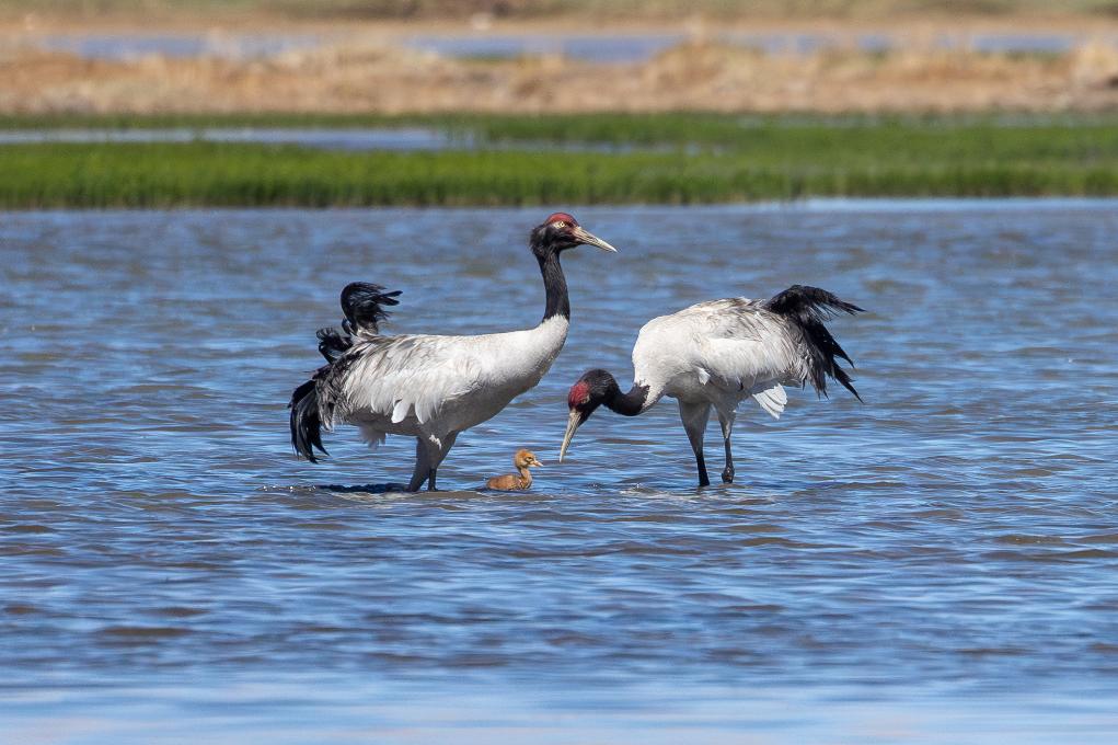 這是6月5日拍攝的那曲市申扎縣周邊申扎藏布濕地里棲息的黑頸鶴和出生不久的小黑頸鶴。 新華社記者 旦增尼瑪曲珠 攝