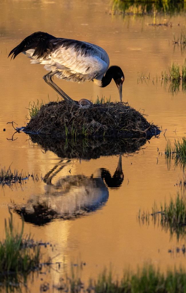 資料記載,黑頸鶴壽命大約為10到15年,通常一生中只有一個配偶;繁殖期在每年的5月至7月,求偶時伴隨著舞動與共鳴——雙雙把頭伸向前方,彼此呼應(yīng)并發(fā)出“咯咯咯”的響聲,這一行為相當(dāng)于每年一次的“求婚”儀式。黑頸鶴營巢于水環(huán)繞的草墩上或茂密的蘆葦叢中,一窩卵通常有2枚。