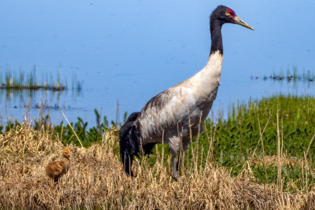 一只黑頸鶴在西藏那曲市申扎縣的申扎藏布濕地上照顧剛出殼的雛鳥(6月5日攝)。 新華社記者 姜帆 攝