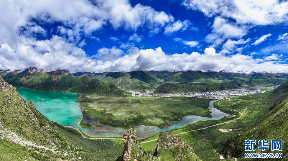 圖為7月2日拍攝的嘉乃玉錯(cuò)與不遠(yuǎn)處的嘉黎縣縣城(無(wú)人機(jī)照片)。新華網(wǎng)發(fā) 車宇軒 攝