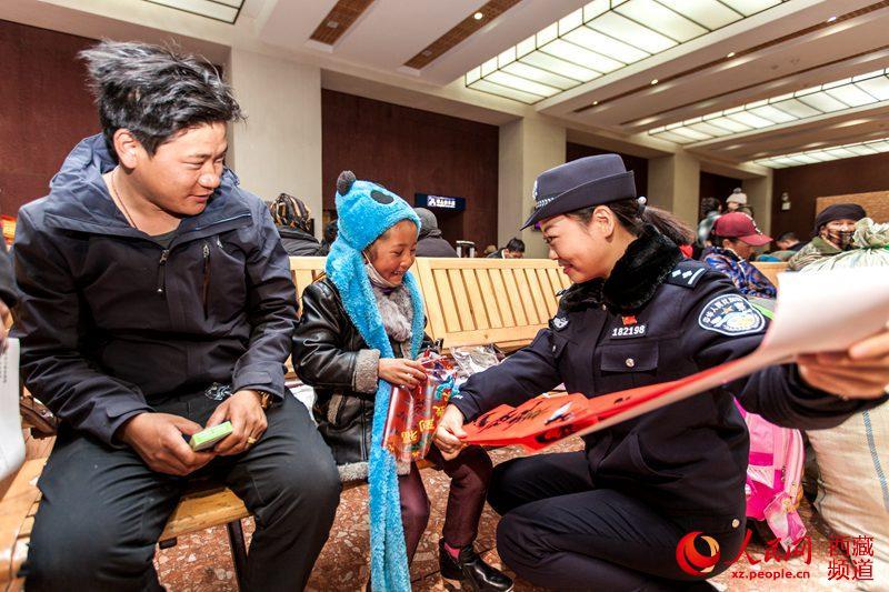 按照“平安出行、有序出行、溫馨出行”工作目標(biāo),拉薩鐵路公安處組織全處各單位干部民警共計(jì)60余人分別在西藏各火車站,緊緊圍繞“服務(wù)旅客為宗旨,待旅客如親人”的理念,開展了春運(yùn)首日暨“一路溫馨一路情 天路鐵警伴您行”主題系列活動(dòng)。圖為拉薩鐵路公安處民警(右一)向“小旅客”發(fā)放春聯(lián)。圖片來源:人民網(wǎng)