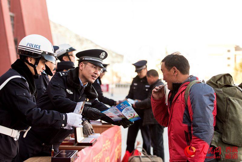 春運(yùn)首日,拉薩鐵路公安處干警為旅客群眾做好事達(dá)800余件,為旅客解答問題3000余次,發(fā)放春運(yùn)各類宣傳資料3000余份,全力打造“平安、有序、溫馨”的春運(yùn)環(huán)境。圖為拉薩鐵路公安處民警為旅客講解禁毒常識(shí)。圖片來源:人民網(wǎng)