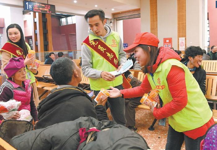 拉薩火車站團(tuán)委聯(lián)合中國移動(dòng)西藏公司開展“黨團(tuán)志愿者愛心送溫暖 服務(wù)春運(yùn)返鄉(xiāng)農(nóng)民工”主題活動(dòng),一個(gè)個(gè)黨團(tuán)員志愿者的身影在候車室里忙碌著。圖為2月1日,中國移動(dòng)西藏公司的志愿者正在拉薩火車站候車室給旅客發(fā)放奶茶、礦泉水。 圖片來源:西藏日?qǐng)?bào) 李洲 攝