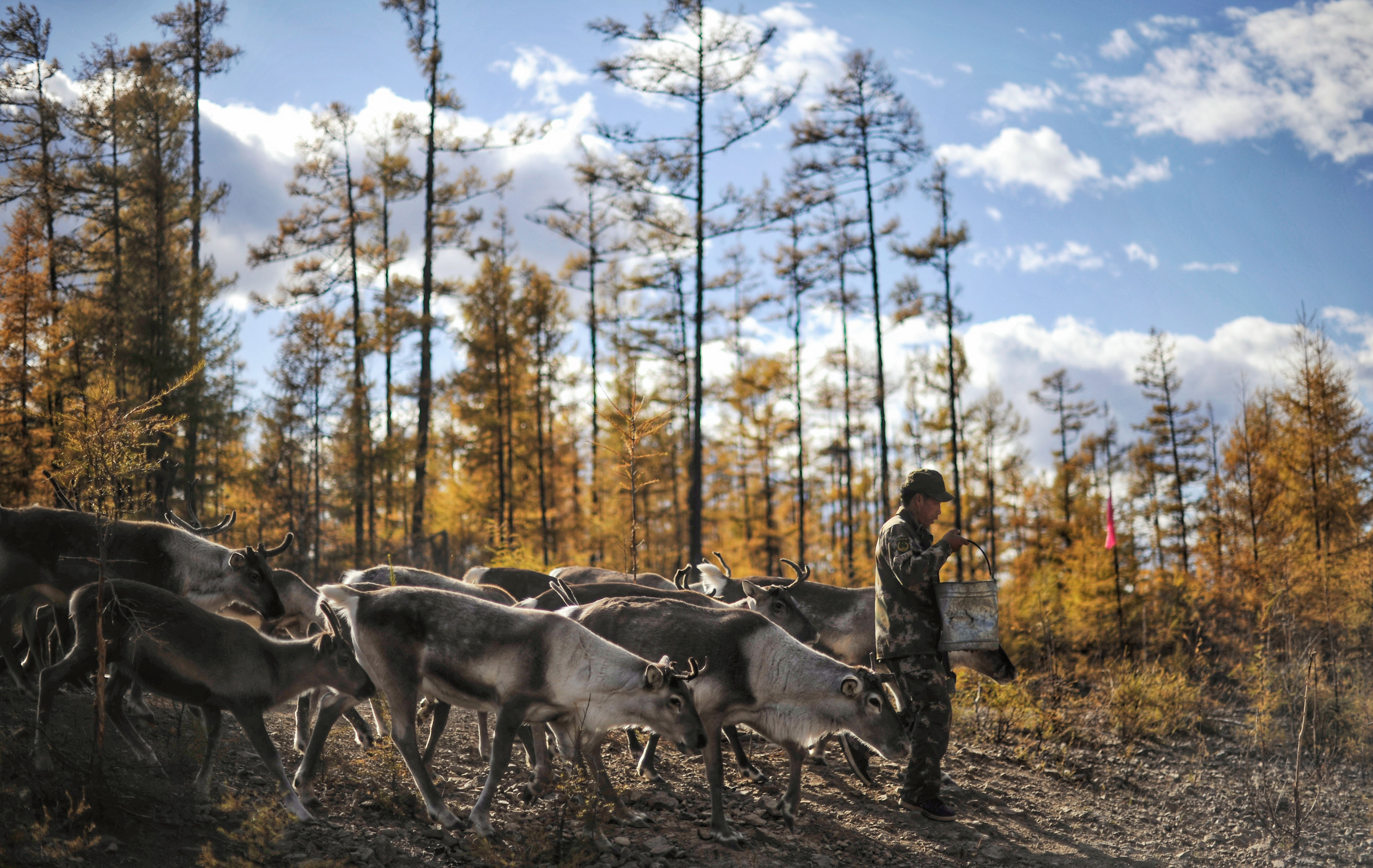 內(nèi)蒙古大興安嶺根河林業(yè)局約安里林場(chǎng),林場(chǎng)職工張國華為馴鹿補(bǔ)充飼料。