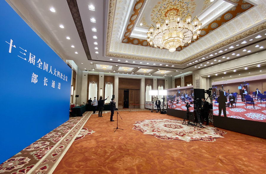 3月5日,十三屆全國人大四次會議開幕會結(jié)束后,舉行首場“部長通道”采訪活動,邀請部分列席會議的國務(wù)院有關(guān)部委負(fù)責(zé)人通過網(wǎng)絡(luò)視頻方式接受采訪。圖為“部長通道”現(xiàn)場。新華網(wǎng) 王翰林 攝