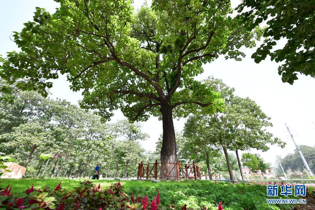 在河南蘭考縣焦裕祿干部學院門口,游客從“焦桐”下走過(2017年8月9日攝)。新華社記者 馮大鵬 攝