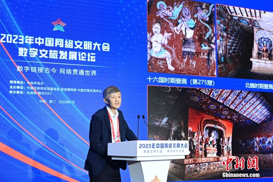 7月19日,2023年中國網(wǎng)絡(luò)文明大會數(shù)字文旅發(fā)展論壇在福建省廈門市舉辦。論壇以“數(shù)字鏈接古今 網(wǎng)絡(luò)貫通世界”為主題,邀請國內(nèi)外數(shù)字化、文博考古、旅游等領(lǐng)域?qū)<液痛砉餐剿鞴偶奈镌跀?shù)字時(shí)代的創(chuàng)造性轉(zhuǎn)化和創(chuàng)新性發(fā)展,以及在數(shù)字技術(shù)賦能下,文旅產(chǎn)業(yè)如何實(shí)現(xiàn)高質(zhì)量發(fā)展。圖為論壇現(xiàn)場。中新社記者 田雨昊 攝