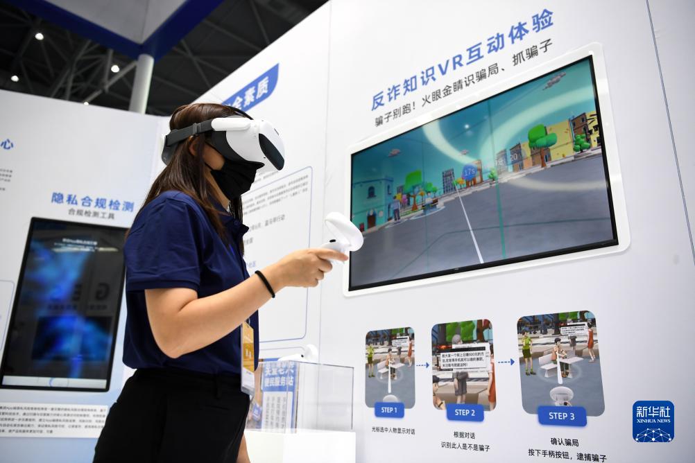 一家參展企業(yè)代表在2022年國家網(wǎng)絡(luò)安全宣傳周網(wǎng)絡(luò)安全博覽會(huì)上演示反詐知識(shí)VR互動(dòng)體驗(yàn)項(xiàng)目(2022年9月4日攝)。新華社記者 劉軍喜 攝