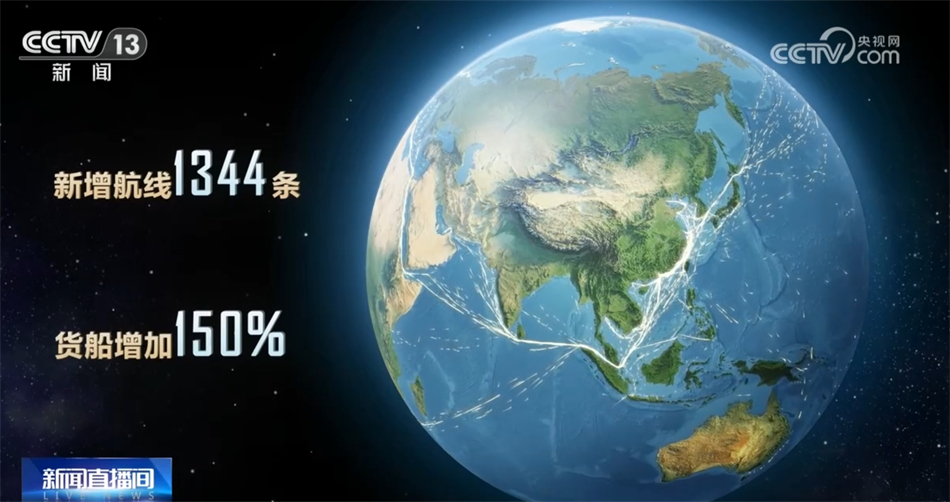 向大海,這是2013年時中國與共建“一帶一路”國家間的水運航線。十年間,共建“一帶一路”國家間的水運航線數(shù)量翻了一番,新增航線達(dá)到了1344條,穿梭其中的貨船增加150%。“絲路海運”航線已通達(dá)全球43個國家的117個港口,織出了一張聯(lián)通世界的貿(mào)易流動網(wǎng)絡(luò)。